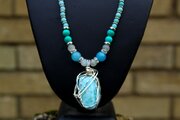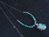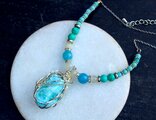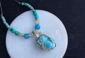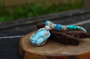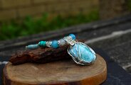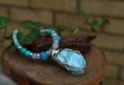 シルバーで巻いたラリマー、6ミリのムーンストーンの間に8ミリのブルークォーツ、6ミリのターコイズ、最後に4ミリのラリマーを組ませました。