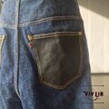 真鍮製のリベットは未処理のブラス生地リベットを使用。暗いトーンへとデニム生地とともに経年変化の楽しめるものとなります。