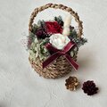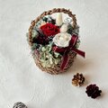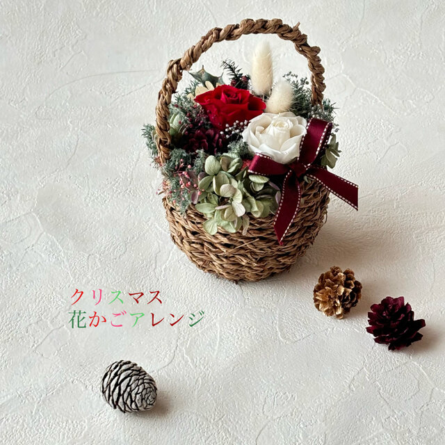 真っ白ならグラスが小さなクリスマスを感じさせる花かごアレンジです。
