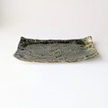 落ち着いた深緑の織部釉と表面の独特な凹凸模様が、自然の景色を思わせる一枚です。縁のゆるやかな立ち上がりが料理を引き立て、盛り付けの幅を広げてくれます。