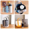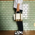 ちょっとそこまでのミニトートサイズですが、水筒、財布、鍵、携帯、ポーチ等、必要最低限のモノは入る感じです。ちょっとそこまでやランチトートとして、犬のお散歩にも、車のお供にポンと置ける日常使いしやすいサイズ感の便利なサイズのミニトートです。
