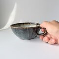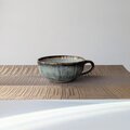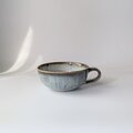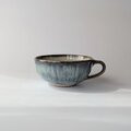 釉薬は、海鼠釉で、淡いブルーの中にきれいな釉薬の流れが現れ高級感のある美しいスープカップが出来上がりました。