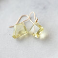 ファンシーシェイプファセットカットのブラジル産宝石質レモンクォーツを使ったピアスです。鮮やかなイエローグリーンがとても美しい透明度が高い宝石質品質の石を使っています。裏面が尖ったファセットカットで正面はテーブル面のあるフラットな形。不定形なフリーフォーム形状でとてもナチュラルな印象です。