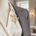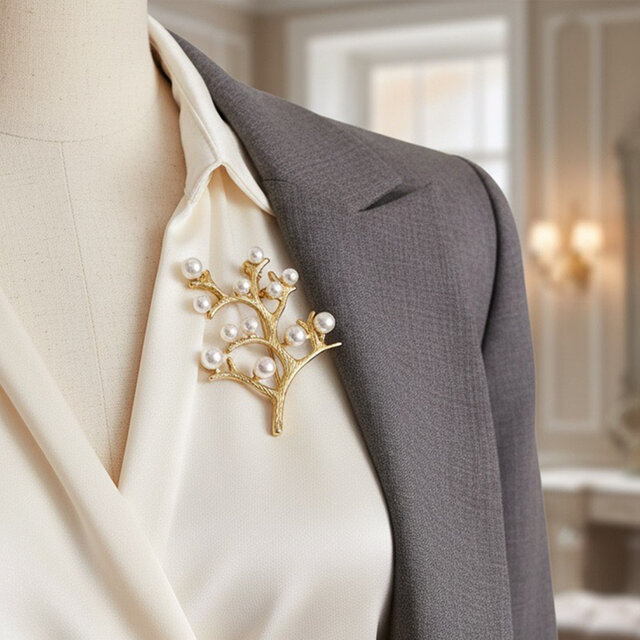 自然が織りなす美しさをそのまま閉じ込めた、繊細で上品なボタニカルデザインのブローチ。アンティーク調のイエローゴールドの枝に真珠のようなホワイトパールが実る姿をイメージした一品です。季節を問わず使えるこのブローチは、ファッションを愛するマダムやセレブリティの装いに華やかさと優雅さをプラスします。ジャケットやストール、ハットなどに合わせることで、スタイリング全体を格上げ。特別な日のギフトにも喜ばれるアイテムです。