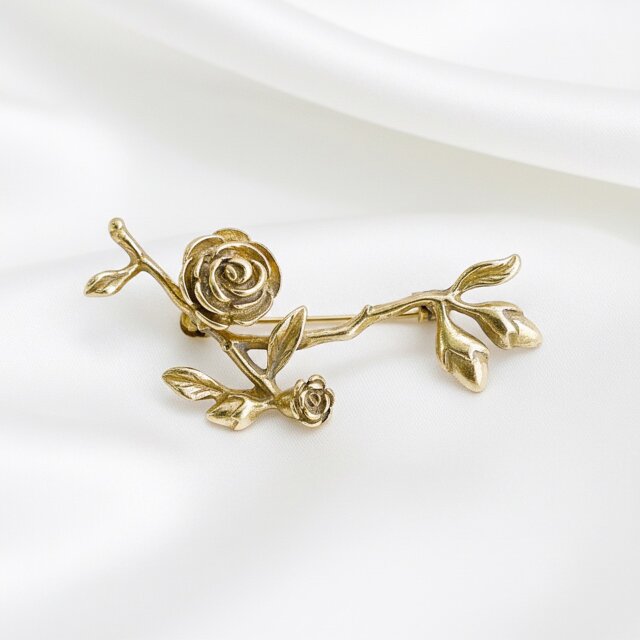 咲き誇るバラと蕾をあしらった「ローズブランチブローチ」。繊細に表現された枝や葉のディテールが、アンティーク調のゴールド仕上げで一層引き立ちます。自然美とエレガンスを融合させたデザインが、大人の女性の装いにぴったりです。フォーマルな場からカジュアルな日常まで、幅広いシーンで活躍するこのブローチは、ジャケットやストール、バッグに添えてご使用いただけます。