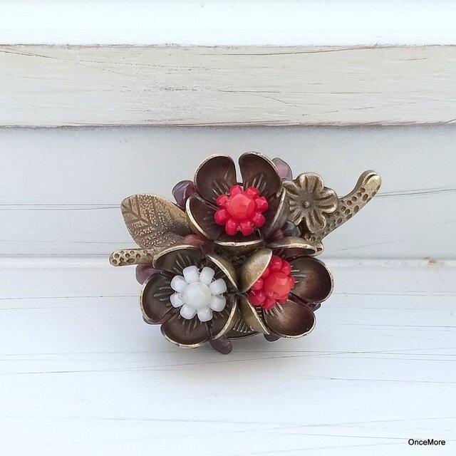 染サンゴの赤玉、マザーオブパールの白玉などで紅梅と白梅を表現しました。