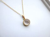 透明感のある淡いピンクの中に、優しく柔らかな光が広がるローズクォーツ。そのローズクォーツで小さなペンダントネックレスをご用意しました。優しい桜色や穏やかな朝焼けを思わせる温かな色合いが特徴です。直径約8mmの天然石のカボションを、繊細な透かし模様の真鍮枠で優しく包み込みました。光の加減で淡くピンク色がさりげなく浮かび上がり、控えめながらも心温まる存在感を放ちます。小さな箱に入れてお届けします。