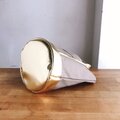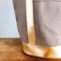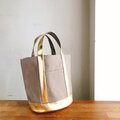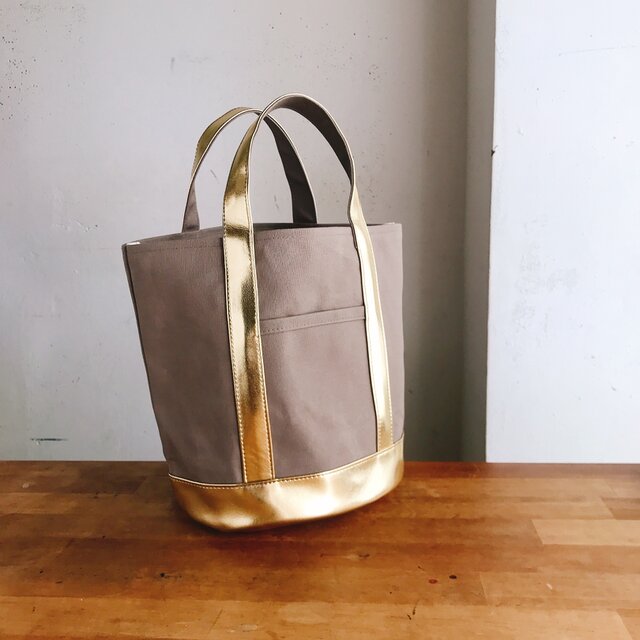 パラフィン加工のしっかりした帆布に合皮のゴールドを合わせました。ありそうでなかった組み合わせで、ガーリーにもメンズライクなファッションにも取り入れやすい色味です!差し色にもピッタリ♪