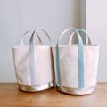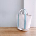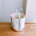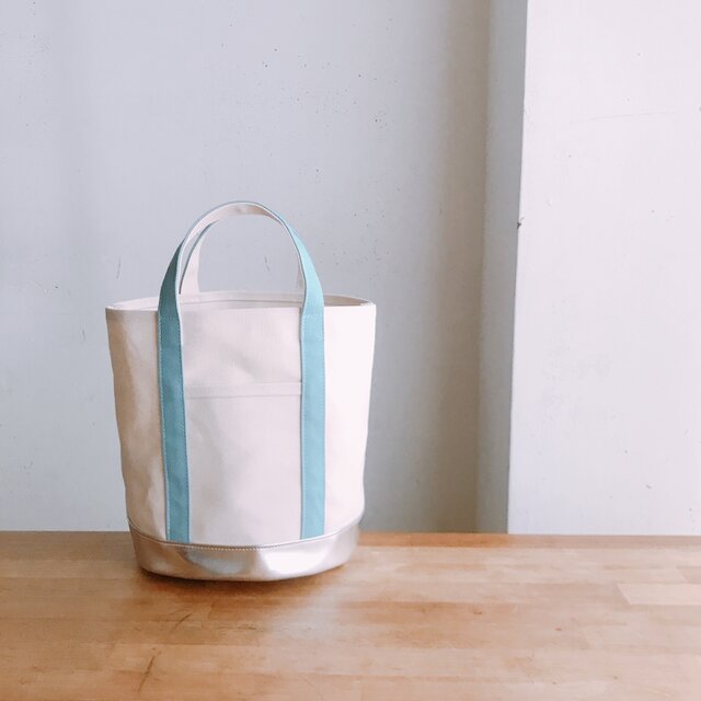 厚めのキナリ帆布を使用した丈夫な丸底トートです!スカイブルーの持ち手にシルバーを合わせて、春夏向けのさわやかカラーで気持ちも上がります♪