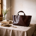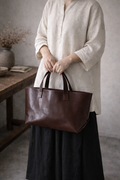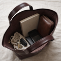 深いダークブラウンの牛革で仕立てたスモールトートです。
