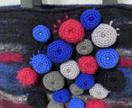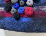 毛糸ボールの中心にビーズをつけ、刺繍もして、遊び心満載の模様です。