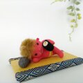 赤おにさんの柔らかなフェルトの質感は、触れると心地よく、手作りの温もりを感じさせます。