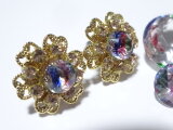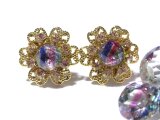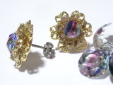 ピーチカラーのヴィンテージストーンパーツをヴィンテージテイストのエレガントな透かしパーツにセット、中心のアイリスガラスストーンがポイントのスタッドピアスです。