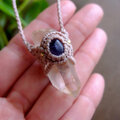 タンジェリンレムリアンクォーツ 水晶ポイント原石(ブラジル産)・アイオライト(3月誕生石)天然石マクラメ編みペンダント 3669