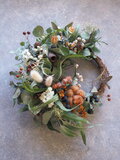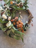 ドライフラワーなのですが、色彩に富んでいて、オレンジ色の木の実や、ブラウンのお花や松ぼっくりが、秋を感じさせてくれます。また、箱を開けた時の、ユーカリの葉のとても良い香りも、嬉しかったです。今回も、素敵なリース、ありがとうございました。