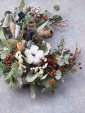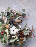 ドライフラワーなのですが、色彩に富んでいて、オレンジ色の木の実や、ブラウンのお花や松ぼっくりが、秋を感じさせてくれます。また、箱を開けた時の、ユーカリの葉のとても良い香りも、嬉しかったです。今回も、素敵なリース、ありがとうございました。