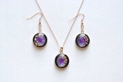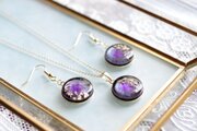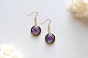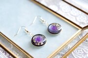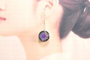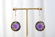 濃淡ある二色の紫に、背景の黒と金箔が映えるピアス。