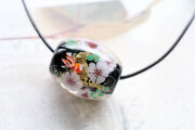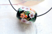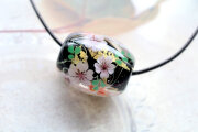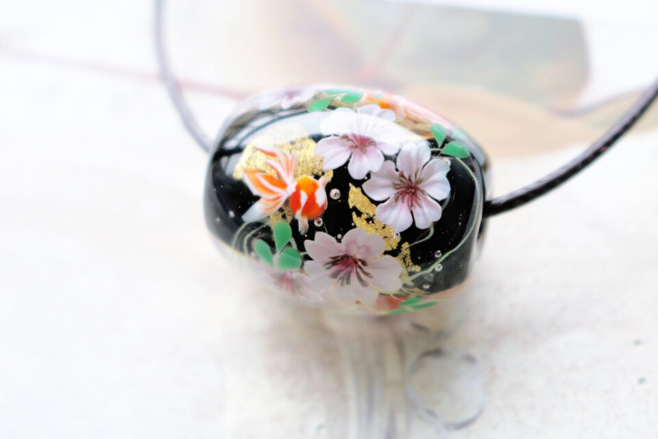 金箔を貼り付けた黒の地に、金魚を泳がせ桜を咲かせたとんぼ玉です。