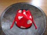 赤地におかめがユニークなアンティーク着物から仕立てたミニ巾着です。