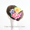 黄色い薔薇と紫の紫陽花のブーケ風の髪飾り フラメンコ ダンス 髪飾り 発表会 春夏 イエロー 黄色 バラ ブーケ ダンス髪飾り