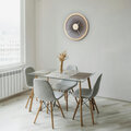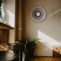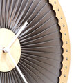 この時計は飛行機のタービンに似ています。 外側のリムと中央のディスクは 60 枚のブレードを固定しており、各ブレードはその長さに沿ってねじれています。外側のリムではブレードは文字盤の表面と平行ですが、中央では垂直になります。これによりエキサイティングな陰影効果が得られます。 時計の後ろの壁が中央のディスクの周りのブレードの間から覗いています。 アウターリムのブレードは短いスチールピンで固定されており、周囲に沿ってスタイリッシュなネジのように見えます。