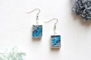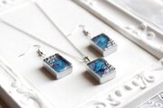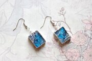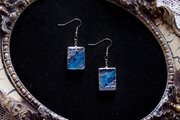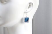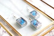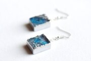 二種類のブルーが滲みあうレジンを銀色で縁取り、青海波模様を描いた、小さな玉手箱のようなピアス。