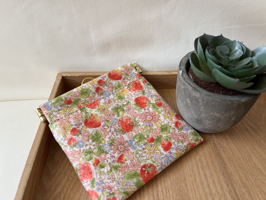 優しいイチゴ柄バネ口ラミネートポーチ
