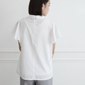 シワになりにくい素材で、少し光沢のある肌ざわりの良い滑らかな素材です。ネック部分のギャザー、袖のフリルが上品に、後ろはジップと1つボタン。