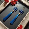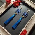 アジアンコード(1mm)で作った吉祥結びとタッセルを組み合わせたピアスです。結びとタッセルの間に取り付けたキラキラとしたゴールドの透かしビーズがアクセントとなっております。