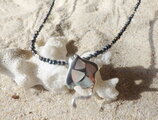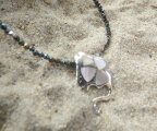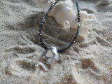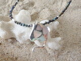 玉虫色、虹色に輝くパウアシェルが胸元でキラリ