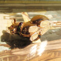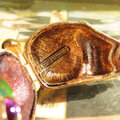 ゴールドトーンにピンクの瞳とグリーンのエナメルの首輪がアクセントになってとてもお洒落です。