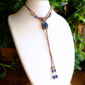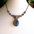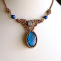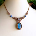 見る角度や光の加減で、石全体に艶やかにブルーグリーンに力強く輝くラブラドレッセンス(シラー)美しいマダガスカル産ラブラドライトと、上部には愛らしいスリランカ産ムーンストーンと両サイドにはラピスラズリを合わせ存在感溢れるマクラメ編みチョーカーネックレスです。魅力的な石を丁寧に編み込んで、首元を彩る女性らしいデザインに仕上げました。