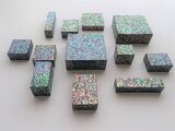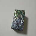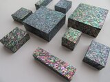 短冊状に切り分けた貝をすべての面に漆でひとつひとつ貼っています。