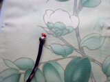中綿を入れ、正絹の着物で作ったループを付け、ループの先にトンボ玉と山サンゴを付けています。