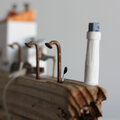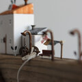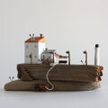 流木、ねじ・釘(赤錆加工)、ホワイトウッド(欧州スプルース、ドイツトウヒなど)、ステイン、ペンキ等で製作。ヤスリでダメージ感を演出しています。「潮騒とカモメの鳴き声、風の音」を感じていただければ幸いです。