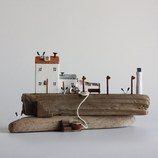 先ほど受け取りました。 流木の風合い、カモメ、岬の先にある白い壁の一軒家…ノスタルジーに誘われ.風や波音が静かに聴こえてきそうな雰囲気のある作品です。早速、リビングの棚に飾りました。 ありがとうございました!