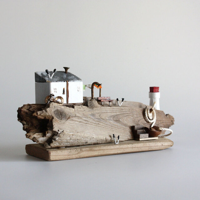 先ほど受け取りました。 流木の風合い、カモメ、岬の先にある白い壁の一軒家…ノスタルジーに誘われ.風や波音が静かに聴こえてきそうな雰囲気のある作品です。早速、リビングの棚に飾りました。 ありがとうございました!