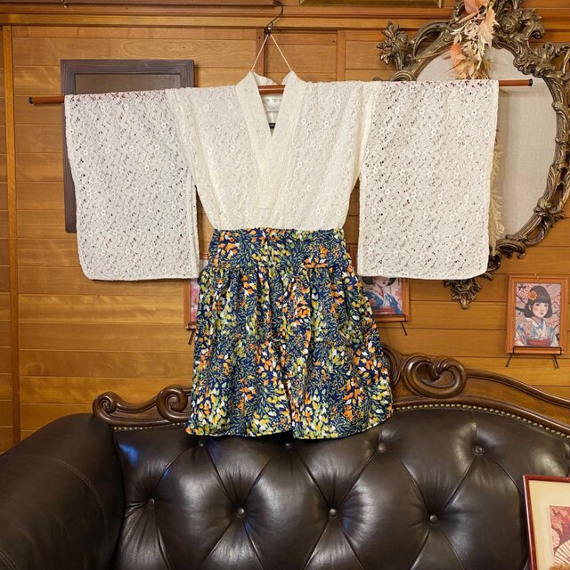 【和ロリ 着物 浴衣 ミニ丈 ワンピース ドレス 名古屋帯サッシュベルト リメイク 和 ハンドメイド レトロ 古着 鮮やかな花柄とレースのコンビネーションがとても素敵です MKW-26 】