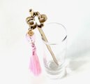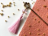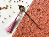 桜型の簪軸とピンクのとんぼ玉でかんざしを制作しました。