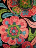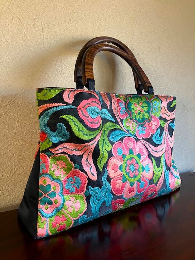 黒の地ということも相まって、細い糸で織り上げられた花唐草の、光沢のある存在感が目をひく手提になりました。