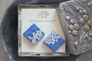 草花をモチーフに消しゴムはんこを彫り、はんこを陶土に捺しつけて凹凸の模様をつけた耳かざりです。