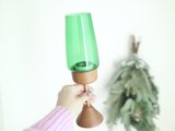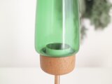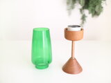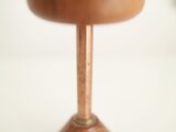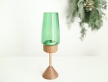 上下セパレートになっていて、上部はグリーンのガラス、下の台座はTEAK(支柱は真鍮)で製造されておりティーキャンドルを置くことが可能です。ガラスフォルムの丸い曲線が美しく、とても品を感じる作品です。