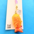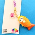 海老フライをモチーフにし、樹脂粘土でチャームを作りました。バラのお花のアイテムを添えています。
