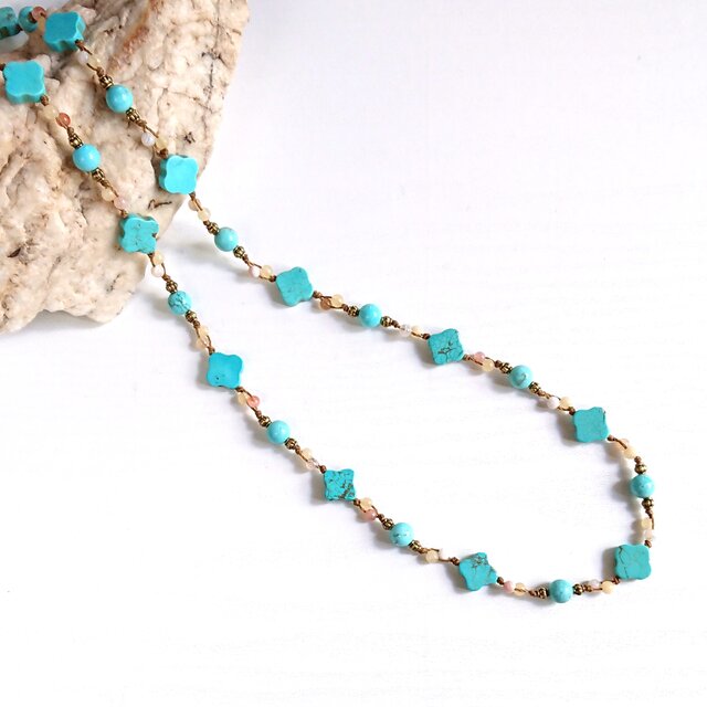 ターコイズブルーとベージュの色合いのロングネックレスです。