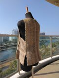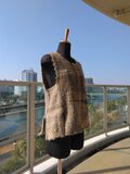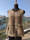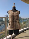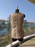 手織りの布から仕立てましたベストです。色合いは地色はベージュ。そこへ緑いろ系や茶系の糸を織り入れています。形は丸首、襟は有りません。脇は両サイド裾で開けています。サイズは7号から9号の方に対応できます。胸幅45センチ、裾幅55センチ、着丈55センチです。