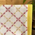 生成りの布地に赤と黄色の2色の糸で