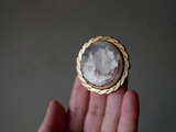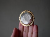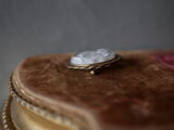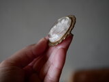 ゴールドトーンのしっかりとした枠に白い花が美しいルーサイトブローチです。