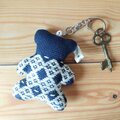 こぎん刺しの伝統模様の洋服を着たみたいな、くま型のマスコットキーホルダー。