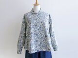 アイボリーの地に水彩画のように繊細に描かれた、青系の花々のプリントが美しい細畝コーデュロイ生地を使った、春のお出かけにもぴったりのブラウスです。
