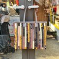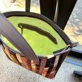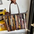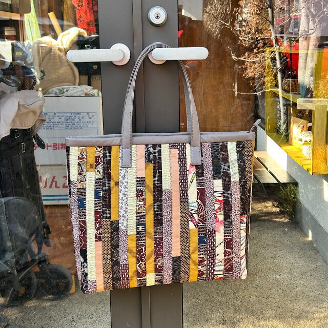 着物生地(古布)をパッチワークして牛革の持ち手を付けて作りました。